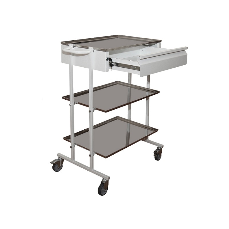 Под столешницей оборудован выдвижной ящик на роликовых направляющих , который оснащен замком. Столик удобно перемещается благодаря двум ручкам по бокам столешницы, которые изготовлены из стальной трубы круглого сечения. Столик комплектуется почкообразным лотком, который крепится с помощью кронштейна. Медицинский столик легко передвигается за счёт четырёх самоориентирующихся колёс “TENTE” диаметром 75мм., два из которых оснащены автономным тормозным устройством.