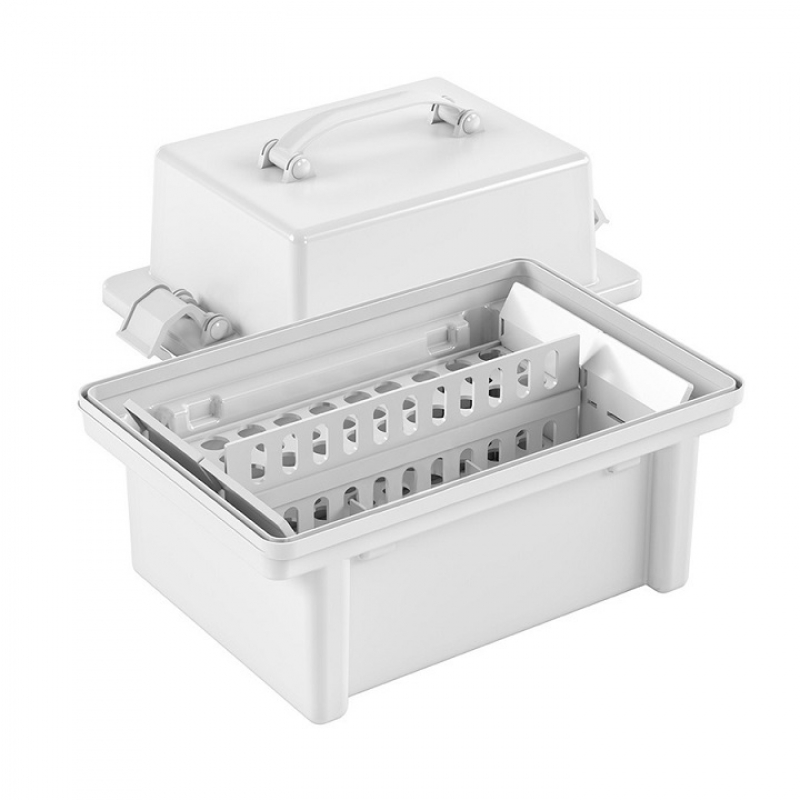 Контейнер УКТП-01 «ЕЛАТ» (вар.1) предназначен для удобного, упорядоченного хранения и транспортировки пробирок и малогабаритного медицинского инструмента.