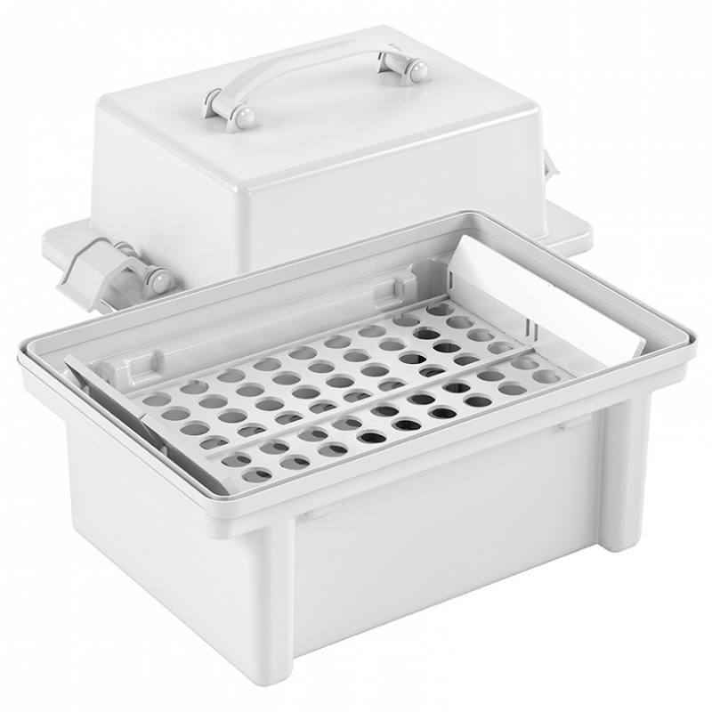 Изготовлена из ударопрочных, химически стойких, нетоксичных материалов: полистирола, полиэтилена и термоэластопласта белого цвета. Состоит из корпуса-поддона, подставки для пробирок (2 шт.), фиксаторов и крышки с ручкой и защелками.