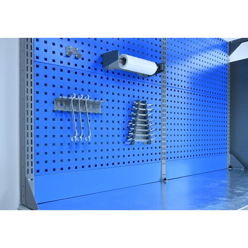 Двойной экран (перфорированные панели) верстака выполнен с квадратной перфорацией 12х12 мм с шагом 38 мм для установки крючков, держателей и других аксессуаров. Экран крепится к столешнице с помощью специальных кронштейнов. Максимальная масса груза, равномерно распределенного по поверхности экрана, составляет 21 кг.