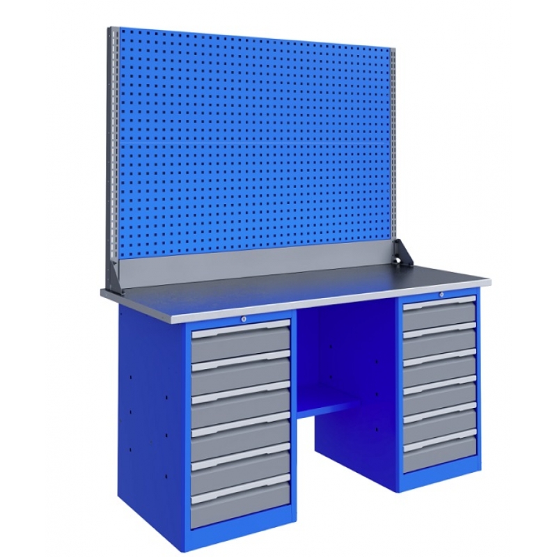 Верстак серии Technic 161.66.1-2 состоит из столешницы шириной 1596 мм, двух тумб P6 с шестью малыми ящиками, полки-стенки, двойного экрана с кронштейнами