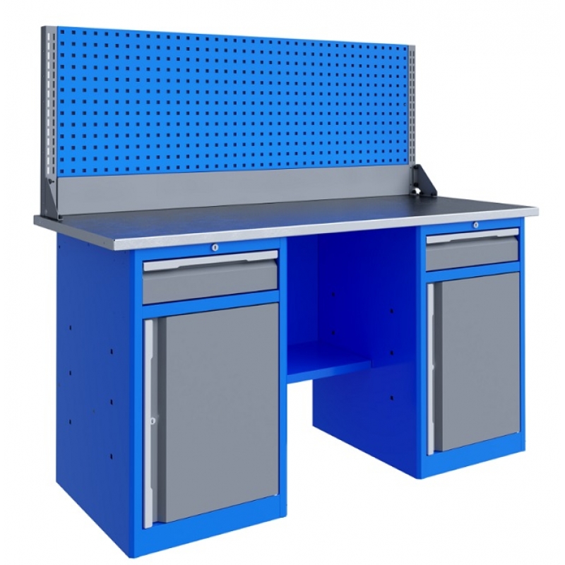Верстак серииTechnic 161.88.1-1 состоит из столешницы шириной 1596 мм, двух тумб P8 с малым ящиком и отделением с дверью, полки-стенки и одинарного экрана с кронштейнами.