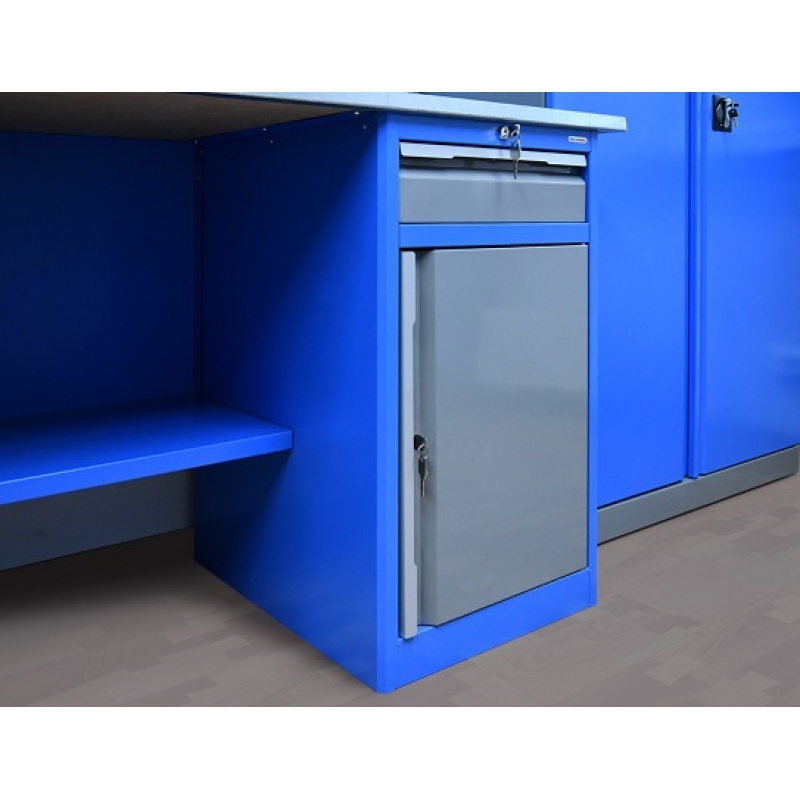 Тумбы верстаков выполнены сварными. Ящики в тумбах устанавливаются на шариковых телескопических направляющих полного выдвижения. В тумбе P8 установлен малый ящик и имеется отделение с дверью и одной полкой. Внутренние размеры малых ящиков (ВхШхГ), не более: 103 х 397 х 520 мм. Ящик снабжен центральным замком с поворотом ригеля 180 градусов и подпружиненной тягой. Полка устанавливается на парах специальных формованных зацепов, выполненных в боковых стенках тумбы. Имеется возможность смены стороны открывания двери. Дверь тумбы снабжена центральным замком с поворотом ригеля 180 градусов. В комплекте имеется два ключа с каждым замком.