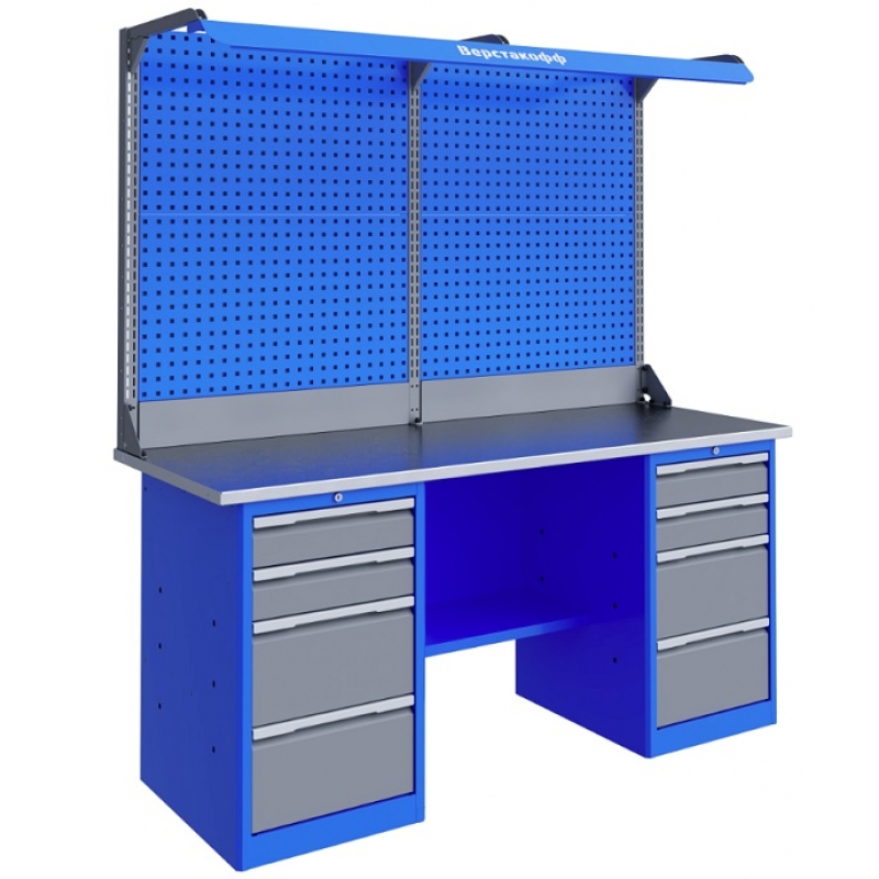 Верстак серии Technic 181.44.2-2F состоит из столешницы шириной 1796 мм, двух тумбы P4 с двумя малыми и двумя большими ящиками, полки-стенки, двойного экрана с кронштейнами и комплекта освещения.