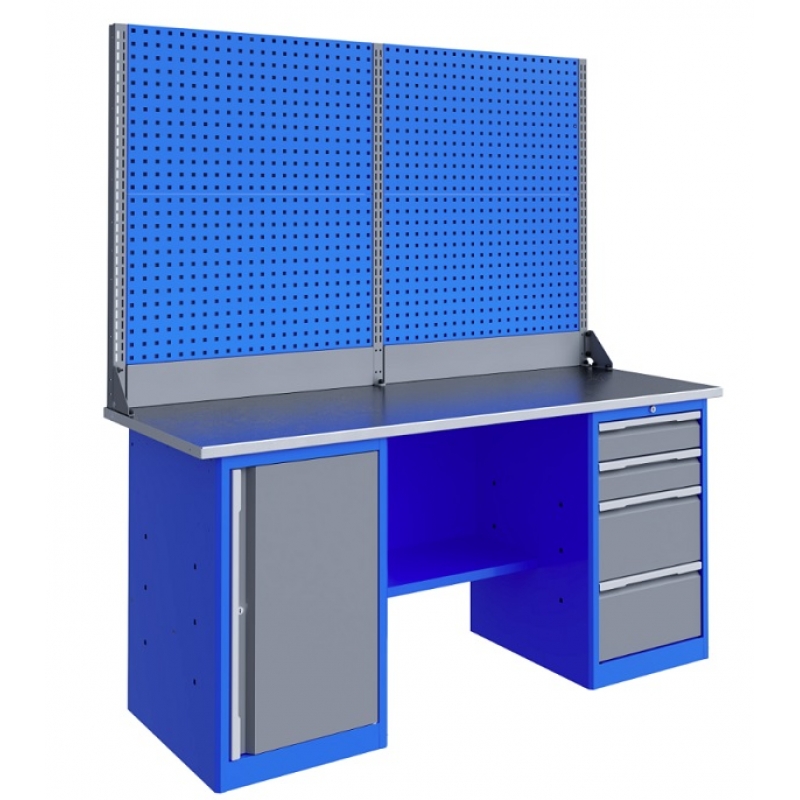 Верстак серии Technic 181.46.2-2 состоит из столешницы шириной 1796 мм, тумбы P4 с двумя малыми и двумя большими ящиками, тумбы P6 с шестью малыми ящиками, полки-стенки, двойного экрана с кронштейнами