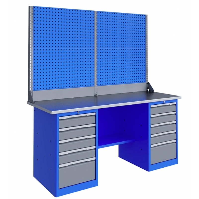 Верстак серии Technic 181.55.2-2 состоит из столешницы шириной 1796 мм, двух тумб P5 с четырьмя малыми и одним большим ящиком, двойного экрана с кронштейнами