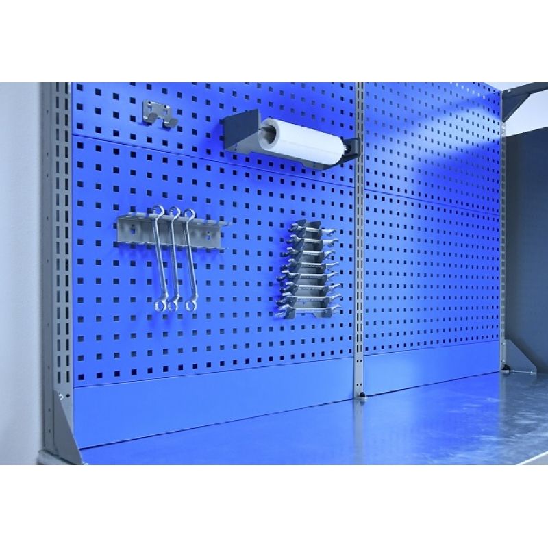 Двойной экран (перфорированные панели) верстака выполнен с квадратной перфорацией 12х12 мм с шагом 38 мм для установки крючков, держателей и других аксессуаров. Экран крепится к столешнице с помощью специальных кронштейнов. Максимальная масса груза, равномерно распределенного по поверхности экрана - 21 кг.