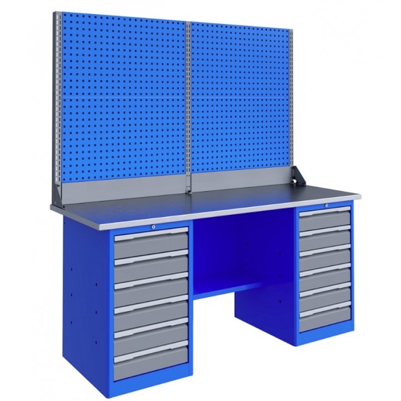 Верстак серии Technic 181.66.2-2 состоит из столешницы шириной 1796 мм, двух тумб P6 с шестью малыми ящиками, полки-стенки, двойного экрана с кронштейнами