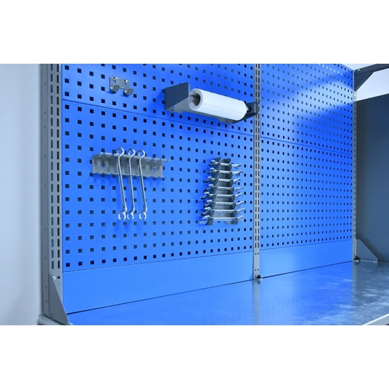 Двойной экран (перфорированные панели) верстака выполнен с квадратной перфорацией 12х12 мм с шагом 38 мм для установки крючков, держателей и других аксессуаров. Экран крепится к столешнице с помощью специальных кронштейнов. Максимальная масса груза, равномерно распределенного по поверхности экрана - 21 кг.