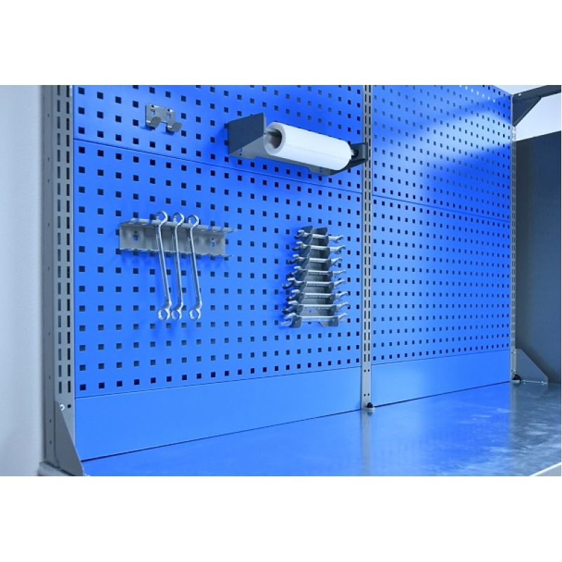 Верстак комплектуется полкой-стенкой, расположенной под столешницей для удобного размещения габаритного инструмента и оснастки.