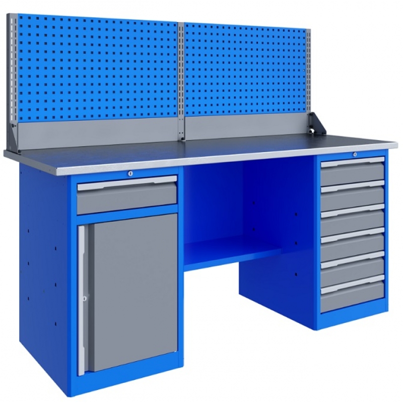 Тумбы верстаков выполнены сварными. Ящики в тумбах устанавливаются на шариковых телескопических направляющих полного выдвижения. В тумбе P6 установлено шесть малых ящиков. Внутренние размеры малых ящиков (ВхШхГ), не более: 103 х 397 х 520 мм. Тумбы с ящиками снабжены общим центральным замком с поворотом ригеля 180 градусов и подпружиненной тягой. В тумбе P8 установлен малый ящик и имеется отделение с дверью и одной полкой. Ящик снабжен центральным замком с поворотом ригеля 180 градусов и подпружиненной тягой. Полка устанавливается на парах специальных формованных зацепов, выполненных в боковых стенках тумбы. Имеется возможность смены стороны открывания двери. Дверь тумбы снабжена центральным замком с поворотом ригеля 180 градусов. В комплекте имеется два ключа с каждым замком.