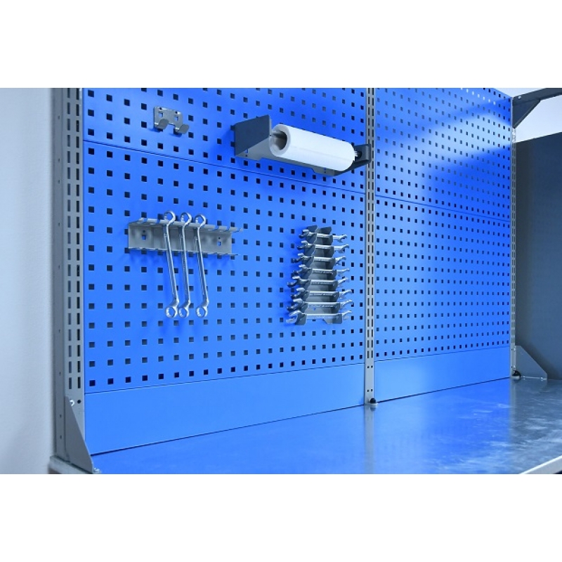 Экран (перфорированная панель) верстака выполнен с квадратной перфорацией 12х12 мм с шагом 38 мм для установки крючков, держателей и других аксессуаров. Экран крепится к столешнице с помощью специальных кронштейнов. Максимальная масса груза, равномерно распределенного по поверхности экрана - 21 кг.