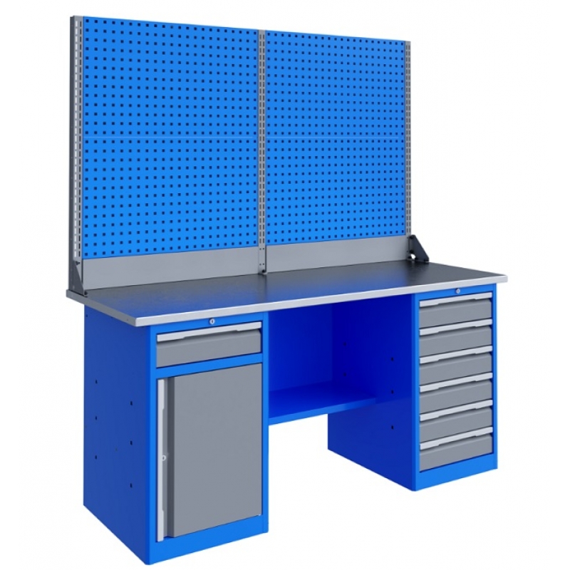 Верстак серии Technic 181.68.2-2 состоит из столешницы шириной 1796 мм, тумбы P6 с шестью малыми ящиками, тумбы P8 с малым ящиком и отделением с дверью, полки-стенки, двойного экрана с кронштейнами