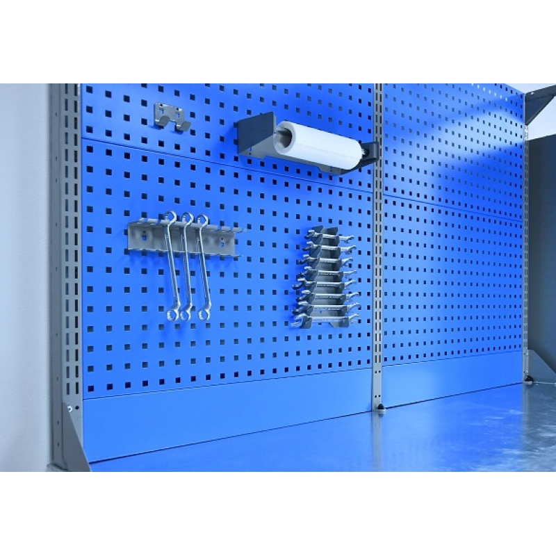 Двойной экран (перфорированные панели) верстака выполнен с квадратной перфорацией 12х12 мм с шагом 38 мм для установки крючков, держателей и других аксессуаров. Экран крепится к столешнице с помощью специальных кронштейнов. Максимальная масса груза, равномерно распределенного по поверхности экрана - 21 кг.