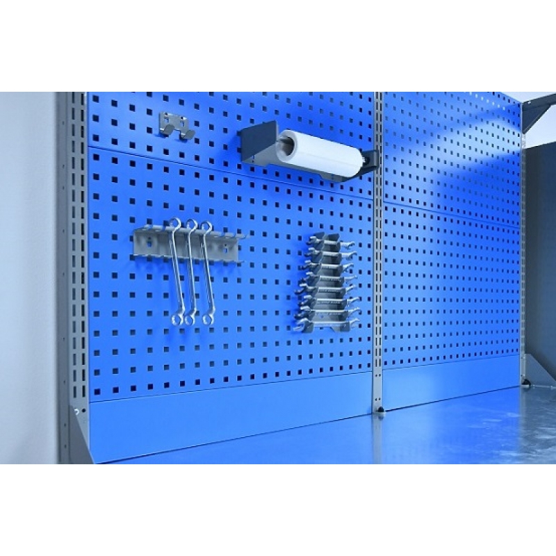 Верстак комплектуется полкой-стенкой, расположенной под столешницей для удобного размещения габаритного инструмента и оснастки.