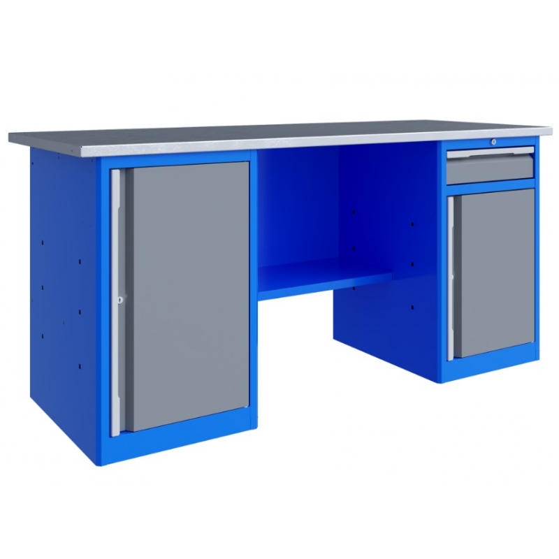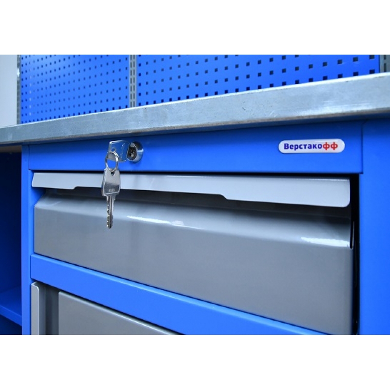 Тумбы верстаков выполнены сварными. В тумбе P7 установлено две полки. Полки устанавливаются на парах специальных формованных зацепов, выполненных в боковых стенках тумбы. Имеется возможность смены стороны открывания двери. Дверь тумбы снабжена центральным замком с поворотом ригеля 180 градусов. В тумбе P8 установлен малый ящик и имеется отделение с дверью и одной полкой. Внутренние размеры малых ящиков (ВхШхГ), не более: 103 х 397 х 520 мм. Ящик снабжен центральным замком с поворотом ригеля 180 градусов и подпружиненной тягой. Полка устанавливается на парах специальных формованных зацепов, выполненных в боковых стенках тумбы. Имеется возможность смены стороны открывания двери. Дверь тумбы снабжена центральным замком с поворотом ригеля 180 градусов. В комплекте имеется два ключа с каждым замком.