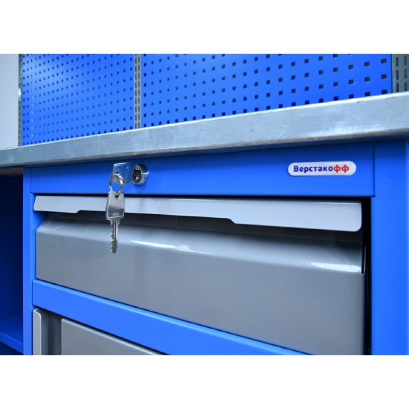 Верстак представляет собой сборно-разборную конструкцию. Верстак комплектуется полкой-стенкой, расположенной под столешницей для удобного размещения габаритного инструмента и оснастки. Все металлические элементы покрыты полиэфирной порошковой краской, обеспечивающей хорошую износостойкость покрытия и невосприимчивость его к моющим средствам и смазочным веществам. Цвет и текстура покрытия корпуса тумб, опор, полки-стенки, экранов и комплектов освещения RAL 5015, гладкая, полуматовая. Цвет и текстура покрытия ящиков и дверок верстака, кронштейнов экранов и косынок RAL 7037, гладкая, глянцевая. Цвет и текстура покрытия накладок ручек ящиков и дверок RAL 9006, гладкая, глянцевая. Столешница состоит из листа влагостойкой фанеры марки ФСФ толщиной 24 мм, которая покрыта лаком-антисептиком и листом оцинкованной холоднокатаной стали толщиной 1,2 мм. Глубина столешниц 696 мм. Максимальная масса груза, равномерно распределенного по столешнице - 1000 кг. Тумбы верстаков выполнены сварными. Ящики в тумбах устанавливаются на шариковых телескопических направляющих полного выдвижения. В тумбе P4 установлено два малых и два больших ящика. Внутренние размеры малых ящиков (ВхШхГ), не более: 103 х 397 х 520 мм. Внутренние размеры больших ящиков (ВхШхГ), не более: 222 х 397 х 520 мм. Тумбы с ящиками снабжены общим центральным замком с поворотом ригеля 180 градусов и подпружиненной тягой. В тумбе P7 установлено две полки. Полки устанавливаются на парах специальных формованных зацепов, выполненных в боковых стенках тумбы. Имеется возможность смены стороны открывания двери. Дверь тумбы снабжена центральным замком с поворотом ригеля 180 градусов. В комплекте два ключа с каждой тумбой. Максимально допустимая масса груза, равномерно распределенного по поверхности любого выдвижного ящика 30 кг (при установке в большой ящик двух пар направляющих 50 кг). Максимальная масса груза, распределенного по поверхности полки и полки стенки - 30 кг. Верстак имеет декларацию соответствия ТР ТС 025/2012 «О безопасности мебельной продукции». Верстак имеет сертификат соответствия ГОСТ Р 58863-2020 «Столы производственные. Верстаки из металла. Общие технические условия».