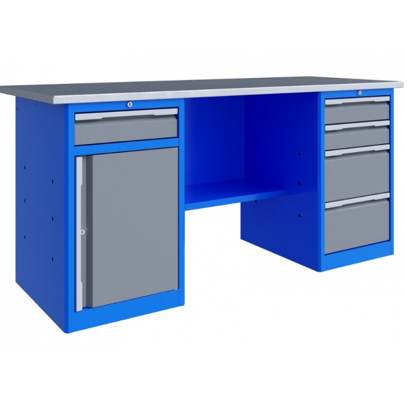 Верстак представляет собой сборно-разборную конструкцию. Верстак комплектуется полкой-стенкой, расположенной под столешницей для удобного размещения габаритного инструмента и оснастки. Все металлические элементы покрыты полиэфирной порошковой краской, обеспечивающей хорошую износостойкость покрытия и невосприимчивость его к моющим средствам и смазочным веществам. Цвет и текстура покрытия корпуса тумб, опор, полки-стенки, экранов и комплектов освещения RAL 5015, гладкая, полуматовая. Цвет и текстура покрытия ящиков и дверок верстака, кронштейнов экранов и косынок RAL 7037, гладкая, глянцевая. Цвет и текстура покрытия накладок ручек ящиков и дверок RAL 9006, гладкая, глянцевая. Столешница состоит из листа влагостойкой фанеры марки ФСФ толщиной 24 мм, которая покрыта лаком-антисептиком и листом оцинкованной холоднокатаной стали толщиной 1,2 мм. Глубина столешниц 696 мм. Максимальная масса груза, равномерно распределенного по столешнице - 1000 кг. Тумбы верстаков выполнены сварными. Ящики в тумбах устанавливаются на шариковых телескопических направляющих полного выдвижения. В тумбе P4 установлено два малых и два больших ящика. Внутренние размеры малых ящиков (ВхШхГ), не более: 103 х 397 х 520 мм. Внутренние размеры больших ящиков (ВхШхГ), не более: 222 х 397 х 520 мм. Тумбы с ящиками снабжены общим центральным замком с поворотом ригеля 180 градусов и подпружиненной тягой. В тумбе P8 установлен малый ящик и имеется отделение с дверью и одной полкой. Ящик снабжен центральным замком с поворотом ригеля 180 градусов и подпружиненной тягой. Полка устанавливается на парах специальных формованных зацепов, выполненных в боковых стенках тумбы. Имеется возможность смены стороны открывания двери. Дверь тумбы снабжена центральным замком с поворотом ригеля 180 градусов. В комплекте имеется два ключа с каждым замком. Максимально допустимая масса груза, равномерно распределенного по поверхности любого выдвижного ящика 30 кг (при установке в большой ящик двух пар направляющих 50 кг). Максимальная масса груза, распределенного по поверхности полки и полки стенки - 30 кг. Верстак имеет декларацию соответствия ТР ТС 025/2012 «О безопасности мебельной продукции». Верстак имеет сертификат соответствия ГОСТ Р 58863-2020 «Столы производственные. Верстаки из металла. Общие технические условия».