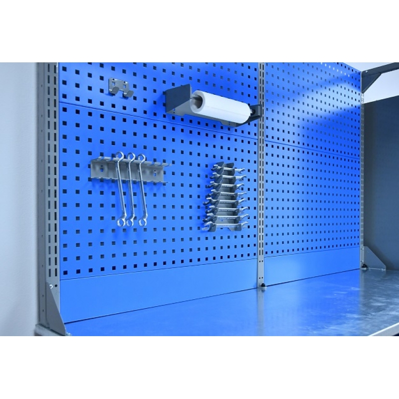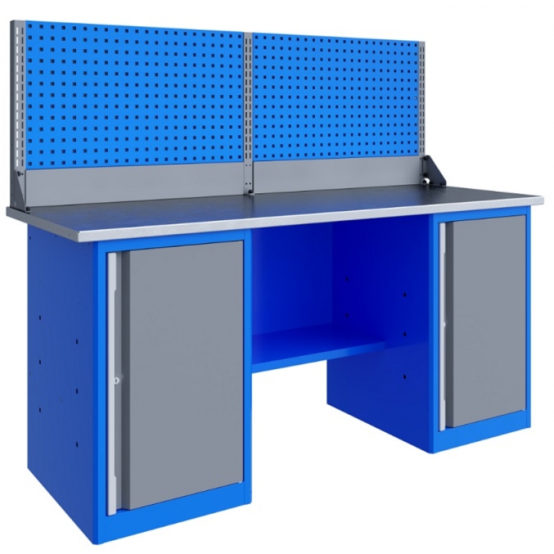 Предназначен для выполнения сборочных, ремонтных, слесарных, монтажных и других видов работ на производстве, в сервисных центрах, мастерских, гаражах, а также для обучения технологии в учебных заведениях. Верстак представляет собой сборно-разборную конструкцию. Верстак комплектуется полкой-стенкой, расположенной под столешницей для удобного размещения габаритного инструмента и оснастки. Все металлические элементы покрыты полиэфирной порошковой краской, обеспечивающей хорошую износостойкость покрытия и невосприимчивость его к моющим средствам и смазочным веществам. Цвет и текстура покрытия корпуса тумб, опор, полки-стенки, экранов и комплектов освещения RAL 5015, гладкая, полуматовая. Цвет и текстура покрытия ящиков и дверок верстака, кронштейнов экранов и косынок RAL 7037, гладкая, глянцевая. Цвет и текстура покрытия накладок ручек ящиков и дверок RAL 9006, гладкая, глянцевая. Столешница состоит из листа влагостойкой фанеры марки ФСФ толщиной 24 мм, которая покрыта лаком-антисептиком и листом оцинкованной холоднокатаной стали толщиной 1,2 мм. Глубина столешниц 696 мм. Максимальная масса груза, равномерно распределенного по столешнице - 1000 кг. Тумбы верстаков выполнены сварными. В тумбе P7 установлено две полки. Полки устанавливаются на парах специальных формованных зацепов, выполненных в боковых стенках тумбы. Имеется возможность смены стороны открывания двери. Дверь тумбы снабжена центральным замком с поворотом ригеля 180 градусов. В комплекте два ключа с каждой тумбой. Максимальная масса груза, распределенного по поверхности полки и полки стенки - 30 кг. Верстак имеет декларацию соответствия ТР ТС 025/2012 «О безопасности мебельной продукции». Верстак имеет сертификат соответствия ГОСТ Р 58863-2020 «Столы производственные. Верстаки из металла. Общие технические условия». Экран (перфорированная панель) верстака выполнен с квадратной перфорацией 12х12 мм с шагом 38 мм для установки крючков, держателей и других аксессуаров. Экран крепится к столешнице с помощью специальных кронштейнов. Максимальная масса груза, равномерно распределенного по поверхности экрана - 21 кг.