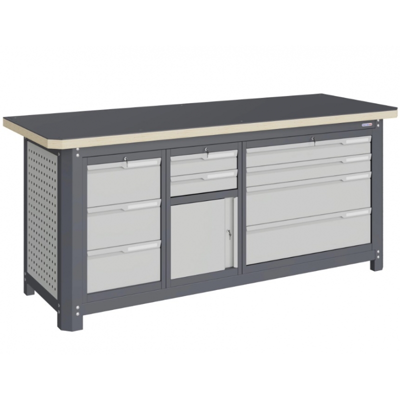 Верстак серии MECHANIC: MCN 2052.S39L4 состоит из столешницы шириной 1993 мм, рамы верстака, состоящей из опор, перемычек, боковых перфопанелей, двух малых модуля S3 и S9, одного большого модуля L4.
