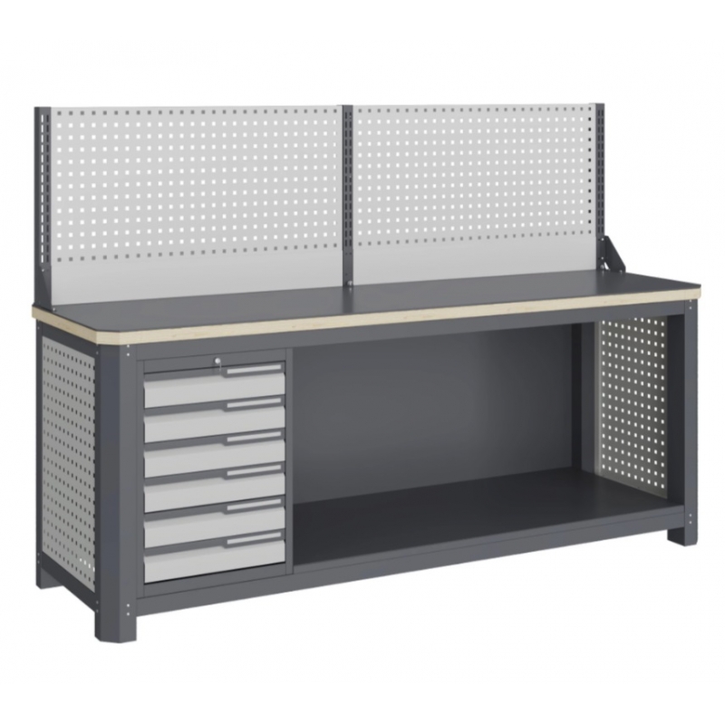Верстак серии MECHANIC: MCN 2052.S6.111-1 состоит из столешницы шириной 1993 мм, рамы верстака, состоящей из опор, перемычек, боковых перфопанелей, малого модуля S6 и трех комплектов полка-стенка SW1, одинарного экрана с кронштейнами. Предназначен для выполнения сборочных, ремонтных, слесарных, монтажных и других видов работ на производстве, в сервисных центрах, мастерских, гаражах.