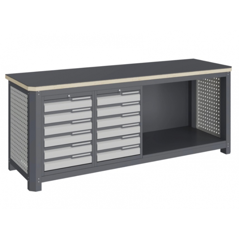 RALЦвет и текстура покрытия рамы верстака, накладки столешницы, корпусов модулей RAL 7024, гладкая, глянцевая. Цвет и текстура покрытия лицевых панелей ящиков и боковых перфопанелей RAL 7047, гладкая, глянцевая. Цвет и текстура покрытия накладок ручек ящиков RAL 9006, гладкая, глянцевая.