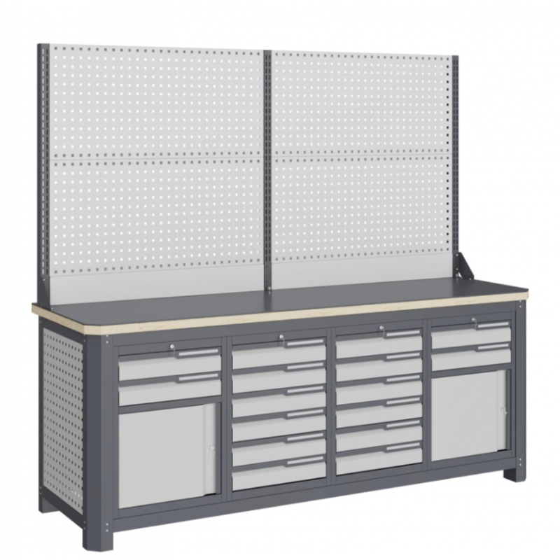 Верстак серии MECHANIC: MCN 2052.S6699-2 состоит из столешницы шириной 1993 мм, рамы верстака, состоящей из опор, перемычек, боковых перфопанелей, малых модулей S6 и S9, одинарного экрана с кронштейнами.