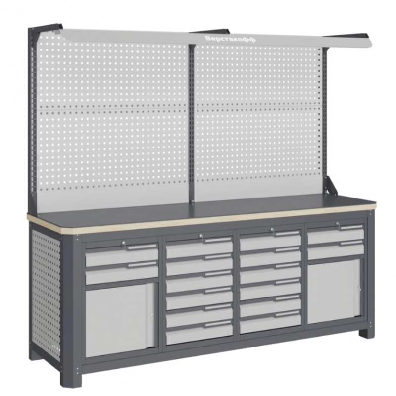 Верстак серии MECHANIC: MCN 2052.S6699-2F состоит из столешницы шириной 1993 мм, рамы верстака, состоящей из опор, перемычек, боковых перфопанелей, малых модулей S6 и S9, двойного экрана с кронштейнами с комплектом освещения. Предназначен для выполнения сборочных, ремонтных, слесарных, монтажных и других видов работ на производстве, в сервисных центрах, мастерских, гаражах.