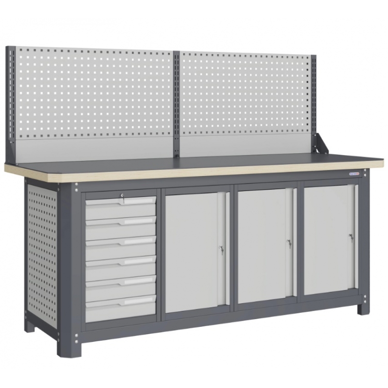 Верстак серии MECHANIC: MCN 2052.S6777-1 состоит из столешницы шириной 1993 мм, рамы верстака, состоящей из опор, перемычек, боковых перфопанелей, малых модулей S6 и S7, одинарного экрана с кронштейнами. Предназначен для выполнения сборочных, ремонтных, слесарных, монтажных и других видов работ на производстве, в сервисных центрах, мастерских, гаражах.