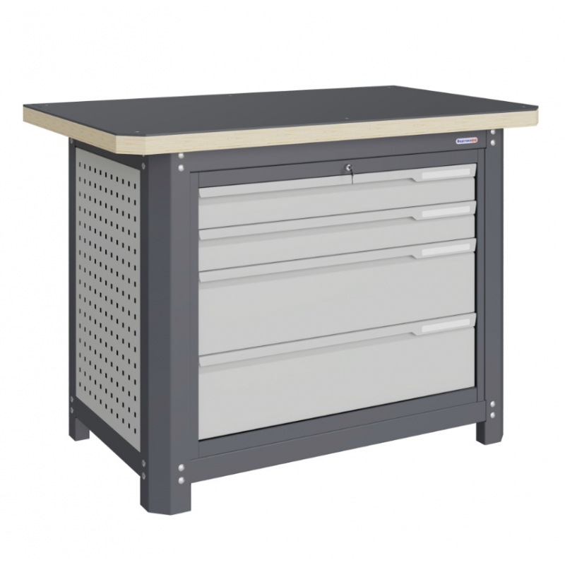 Верстак серии MECHANIC: MCN 1252.L4 состоит из столешницы шириной 1193 мм, рамы верстака, состоящей из опор, перемычек, боковых перфопанелей, большого модуля L4.