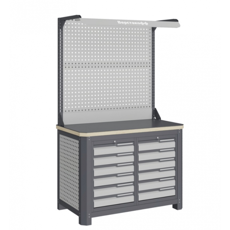 Рабочее место MECHANIC: MCN 1252.S66-2F состоит из столешницы шириной 1193 мм, рамы верстака, состоящей из опор, перемычек, боковых перфопанелей, двух небольших модулей с ящиками S6, двойного экрана с кронштейнами и комплектом освещения. Предназначен для выполнения сборочных, ремонтных, слесарных, монтажных и других видов работ на производстве, в сервисных центрах, мастерских, гаражах.