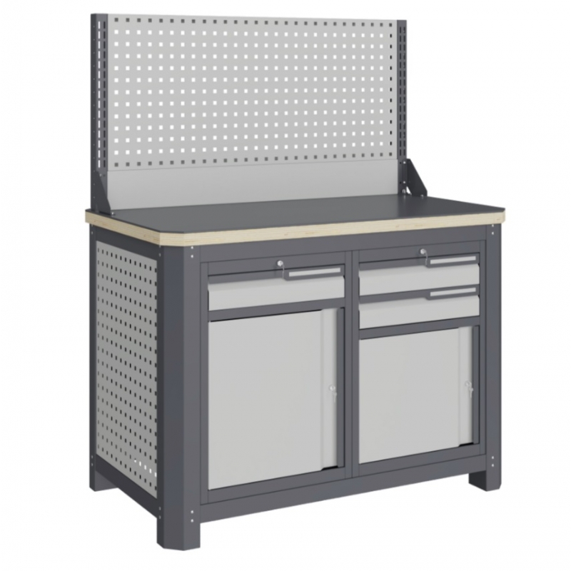 Рабочее место MECHANIC: MCN 1252.S89-1 состоит из столешницы шириной 1193 мм, рамы верстака, состоящей из опор, перемычек, боковых перфопанелей, двух небольших модулей S8 (один ящик и дверца) и S9 ( два ящика и дверца), экрана с кронштейнами. Предназначен для выполнения сборочных, ремонтных, слесарных, монтажных и других видов работ на производстве, в сервисных центрах, мастерских, гаражах.