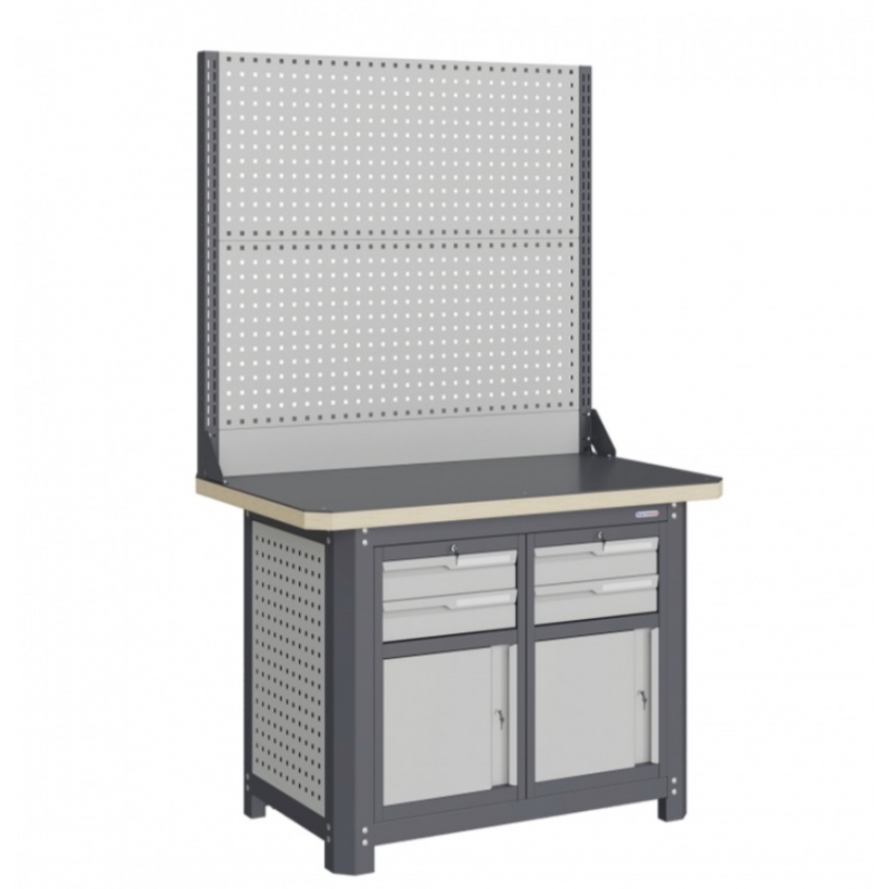 Рабочее место MECHANIC: MCN 1252.S99-2 состоит из столешницы шириной 1193 мм, рамы верстака, состоящей из опор, перемычек, боковых перфопанелей, двух небольших модулей S9 (два ящика и дверца), двойного экрана с кронштейнами.