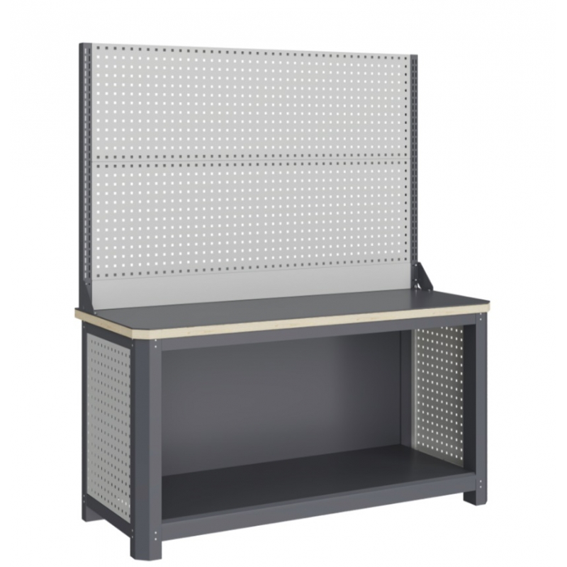 Экран (перфорированная панель) верстака выполнен с квадратной перфорацией 12х12 мм с шагом 38 мм для установки крючков, держателей и других аксессуаров. Экран крепятся к столешнице с помощью специальных кронштейнов. Максимальная масса груза, равномерно распределенного по поверхности экрана, составляет 71 кг.