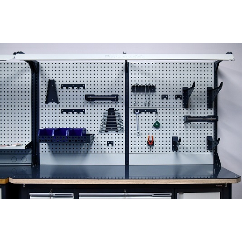 Экран (перфорированная панель) верстака выполнен с квадратной перфорацией 12х12 мм с шагом 38 мм для установки крючков, держателей и других аксессуаров. Экран крепятся к столешнице с помощью специальных кронштейнов. Максимальная масса груза, равномерно распределенного по поверхности экрана, составляет 71 кг.