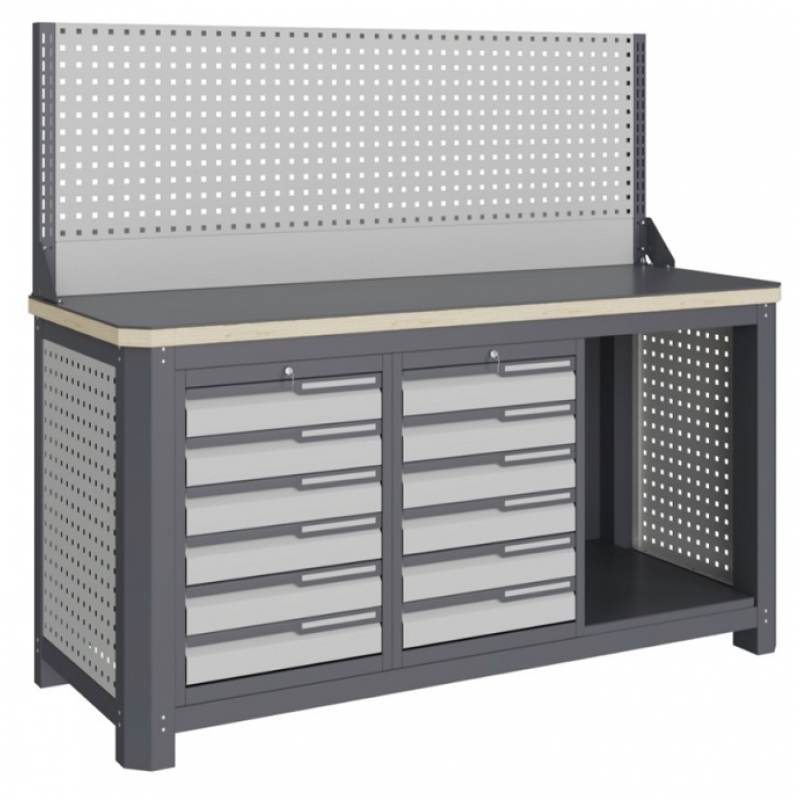 RALЦвет и текстура покрытия рамы верстака, накладки столешницы, корпусов модулей RAL 7024, гладкая, глянцевая. Цвет и текстура покрытия лицевых панелей ящиков и боковых перфопанелей RAL 7047, гладкая, глянцевая. Цвет и текстура покрытия накладок ручек ящиков RAL 9006, гладкая, глянцевая.