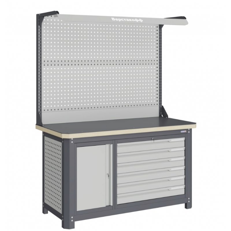 Верстак серии MECHANIC: MCN 1552.S7L6-2F состоит из столешницы шириной 1493 мм, рамы верстака, состоящей из опор, перемычек, боковых перфопанелей, малого модуля S7, большого модуля L6, двойного экрана с кронштейнами и комплекта освещения. Предназначен для выполнения сборочных, ремонтных, слесарных, монтажных и других видов работ на производстве, в сервисных центрах, мастерских, гаражах.