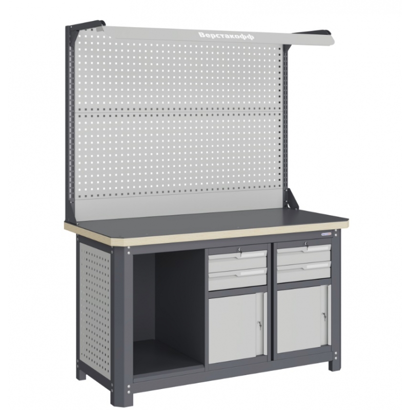 Верстак серии MECHANIC: MCN 1552.S99.1-2F состоит из столешницы шириной 1493 мм, рамы верстака, состоящей из опор, перемычек, боковых перфопанелей, двух малых модулей S9, комплекта полка-стенка SW1, двойного экрана с кронштейнами и комплектом освещения. Предназначен для выполнения сборочных, ремонтных, слесарных, монтажных и других видов работ на производстве, в сервисных центрах, мастерских, гаражах.