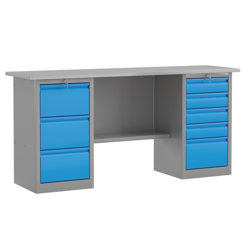 Опорой данной конструкции служат объемные тумбы с тремя и пятью ящиками. Каждая тумба оснащена центральным замком. Любой инструмент будет всегда у вас под рукой. В комплектации предусмотрена нижняя полка.
